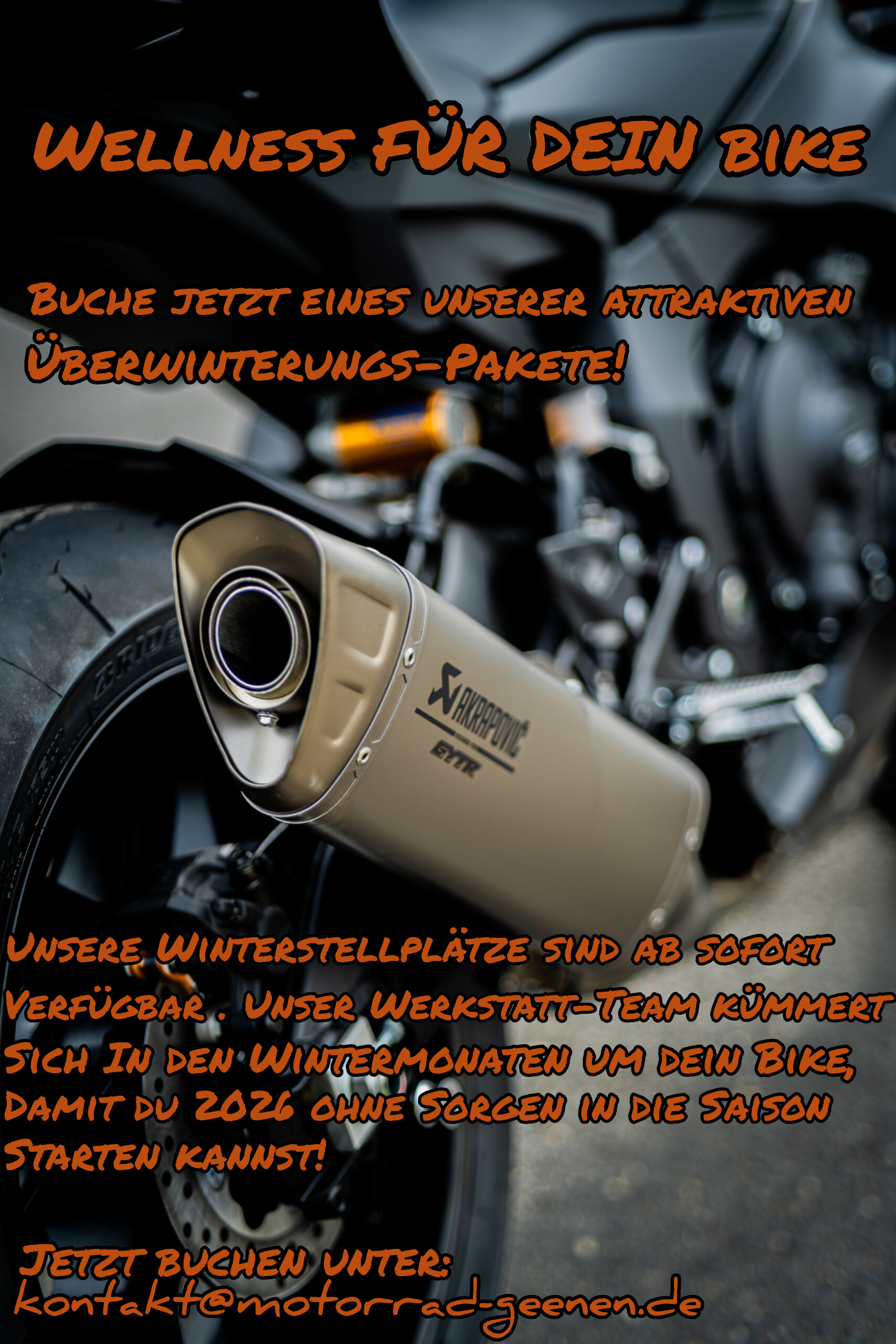 Unsere Winterstellplätze sind ab sofort verfügbar. Unser Werkstatt-Team kümmert sich in den Wintermonaten um Dein Bike, damit du 2026 ohne Sorgen in die Saison starten kannst!